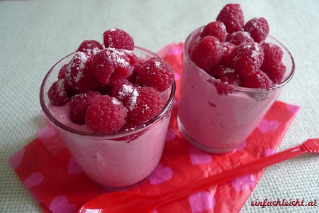 Die Zutaten alle gemeinsam mit dem Pürierstab mixen. Dann in schöne Gläser füllen und genießen. Wer mag, kann auch frische Himbeeren dazu essen.