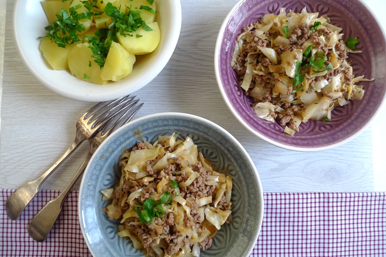 Zwiebel und Faschiertes anrösten, ein wenig Tomatenmark mitrösten, mit Weisswein ablöschen und mit Suppe aufgiessen. Dann das geschnittene Weisskraut dazugeben und dünsten. Mit Kokosmilch verfeiern und mit Kümmel und Thymian würzen, wer will gibt noch geriebenem Parmesan darüber. Mit gehackter Petersilie anrichten. Dazu gibts Kartoffeln.