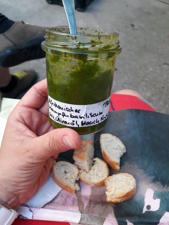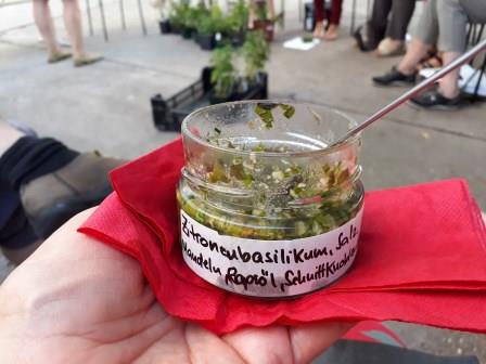 So, aber jetzt geht’s ans Verarbeiten von Basilikum! Auf die Frage, wie man Basilikum am besten überwintert, kam von unserer Workshop-Leiterin ganz klar „als Pesto“! Also dann, ran an den Mixer! Lasst uns Pesto machen, und damit dann einen erfrischenden Mediterranen Nudelsalat.