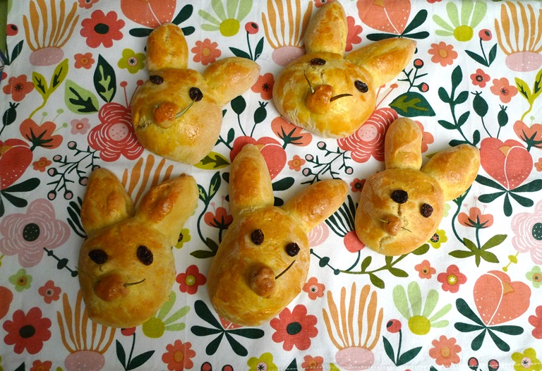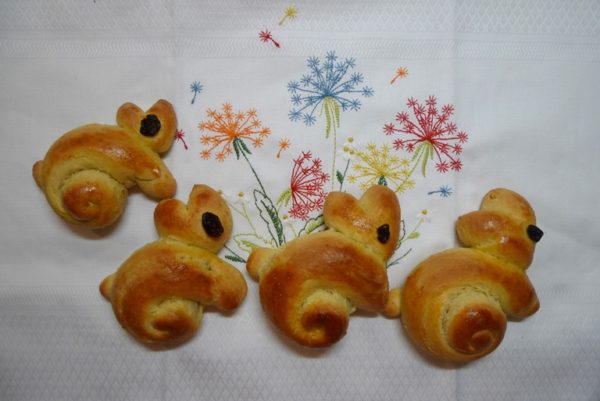 Alle Zutaten zu einem geschmeidigen Teig kneten, mit der Milch und Mehl kann man etwas variieren, wenn der Teig zu freucht oder zu trocken ist. Den Teig ca. 30 Minuten an einem warmen Ort gehen lassen. Ich stelle meinen Teig in den Backofen bei ca. 30°. Wenn der Teig schön aufgegangen ist, mit der Hand vorsichtig noch etwas durchkneten. Dann den Teig in 12 Teile teilen. Von jedem Teil etwa ein Drittel abschneiden und daraus Ohren formen. Diese auf ein Backblech mit Backpapier legen, untere Teile etwas flacher drücken und den restlichen Teig als „Kopf“ daraufsetzen. Rosinen als Augen einsetzen und aus einem Stückchen Teig kleine Stupsnasen formen. Als Barthaare können Rosmarinzweige verwendet werden. Mit einem verqirlten Ei bestreichen und bei 170° im vorgeheizten Backrohr etwa 20 Minuten backen. Ich habe je 6 Häschen auf einem Blech gebacken.