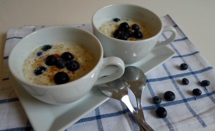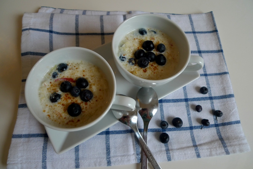 Den Couscous mit der Milch für 2 Minuten in die Mikrowelle. Kurz nachquellen lassen. Dann 1 EL Puddingpulver – welche Sorte grad das Herz begehrt oder verfügbar ist – einrühren und mit Flüssigsüßstoff oder etwas Zucker süßen, umrühren und nochmal 1 Minute in die Mikrowelle. Gerne schnipsle ich mir dann noch eine Banane drauf oder toppe mit Himbeeren.